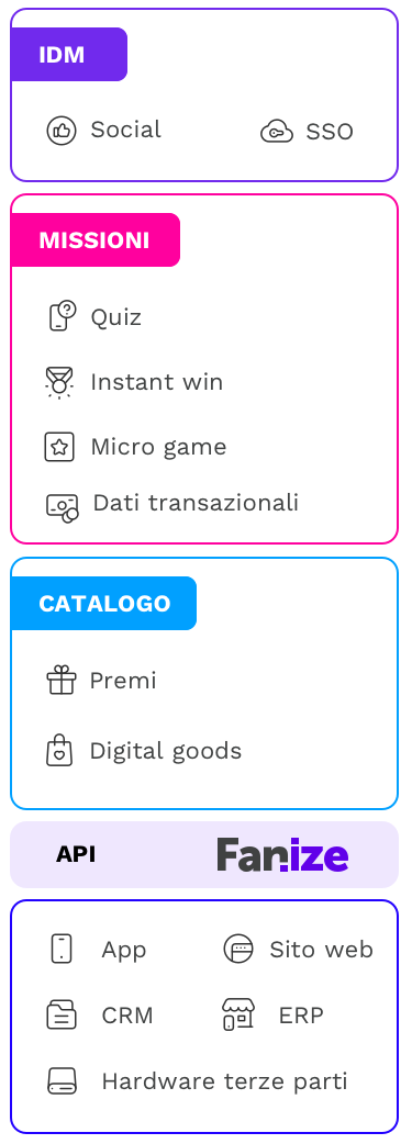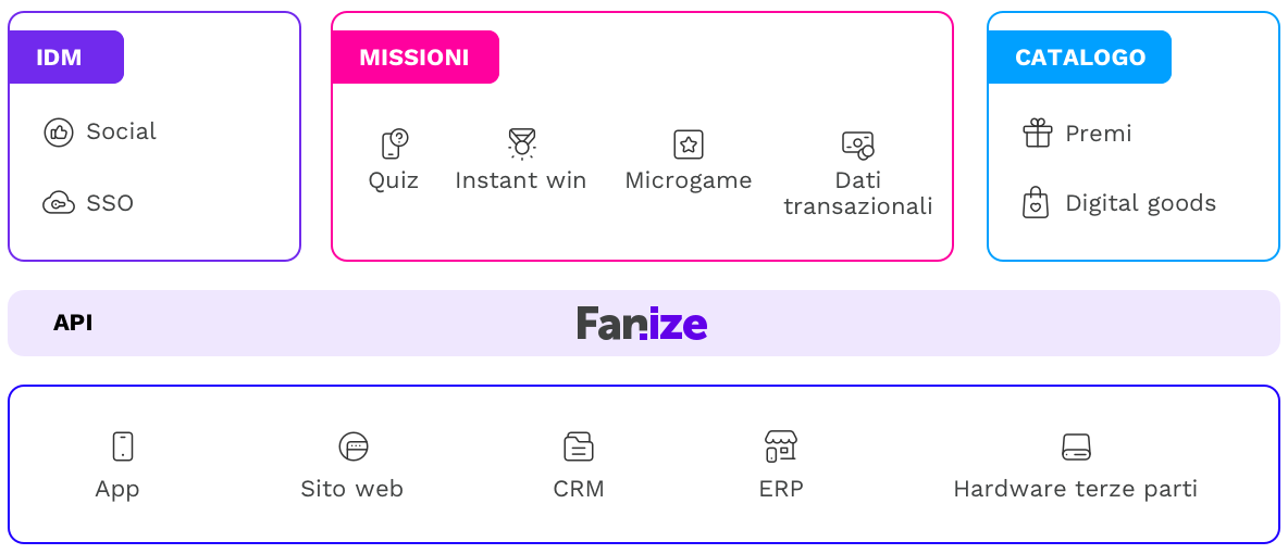 Grazie alla propria modularità Fanize permette di integrare anche sistemi di terze parti, quali app e siti web esistenti, i principali CRM e ERP sul mercato, i sistemi di cassa e i touchpoint fisici come totem e videowall.